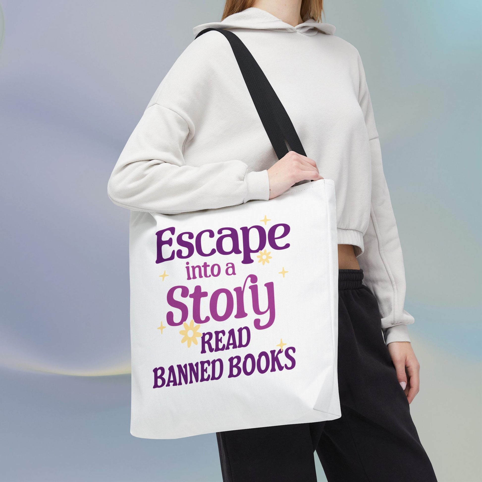 This unique tote features a captivating design that invites users to "Escape into a Story" and "Read Banned Books," making it a perfect accessory for literary enthusiasts and advocates.